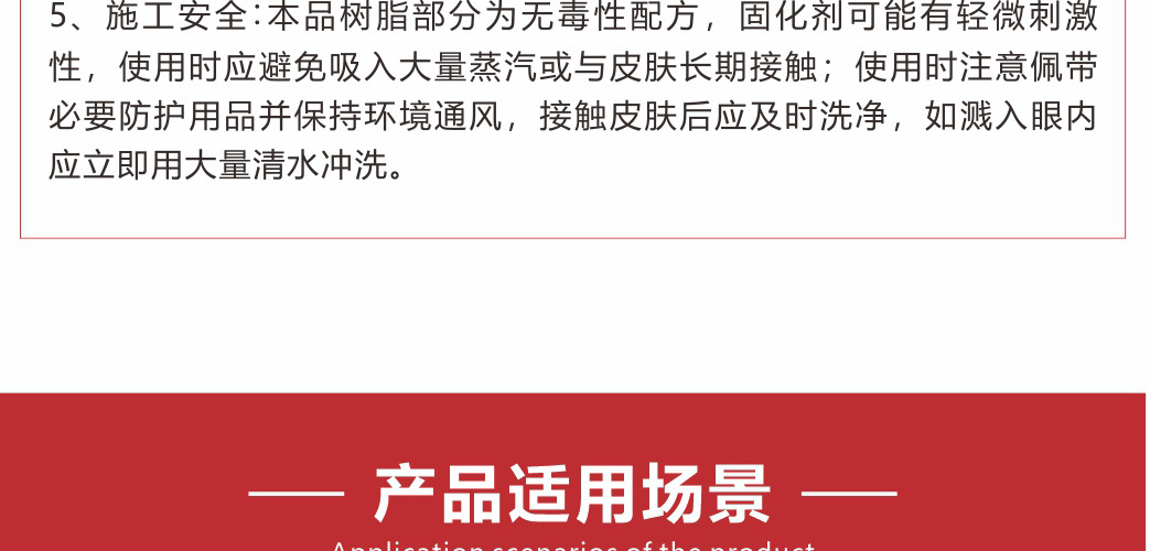 本品樹脂部分為無毒性配方,固化劑可能有輕微刺激性,使用時應(yīng)避免吸入大量蒸汽或與皮膚長期接觸;使用時注意佩帶必要防護(hù)用品并保持環(huán)境通風(fēng),接觸皮膚后應(yīng)及時洗凈,如濺入眼內(nèi)應(yīng)立即用大量清水沖洗。